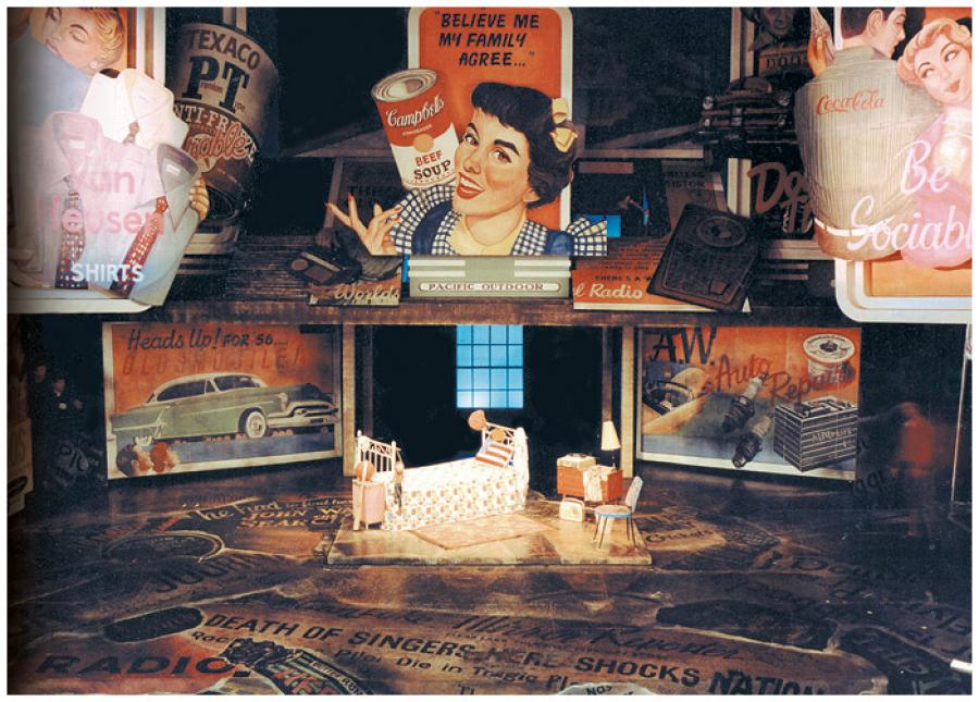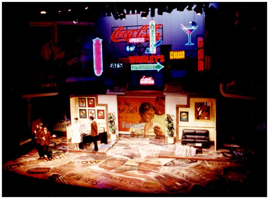 1950's America was a wash with advertising and billboards so I took that motif as my core design with the stage crammed with various billboards and giant glossy magazine ads that slid,lifted and pivoted out place to allow what ended up being 22 scene changes worth of scenery to enter the stage automated on a series of tracks hidden in the floor.