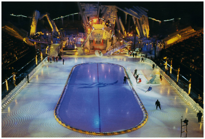 Building this set and the dozens of games was a huge undertaking and over 80 trailers of scenery where delivered to the Manchester nymex Ice hockey arena as 3 crews of people worked around the clock to build the set.