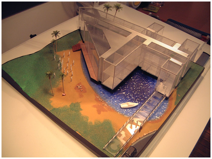 I was asked by Granada TV to design not a set but an entire building for a breakfast show they where pitching to the network Channel 4. I loved the idea that the opening titles could use a helicopter shot over the building that would be shaped as per the number 4. I also put a beach palm trees and lake outside the studio window which was an ironic joke as the building was to be built in rainy Manchester.