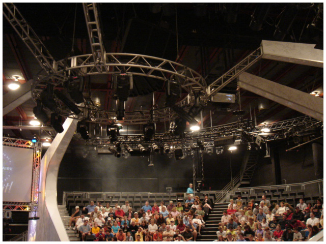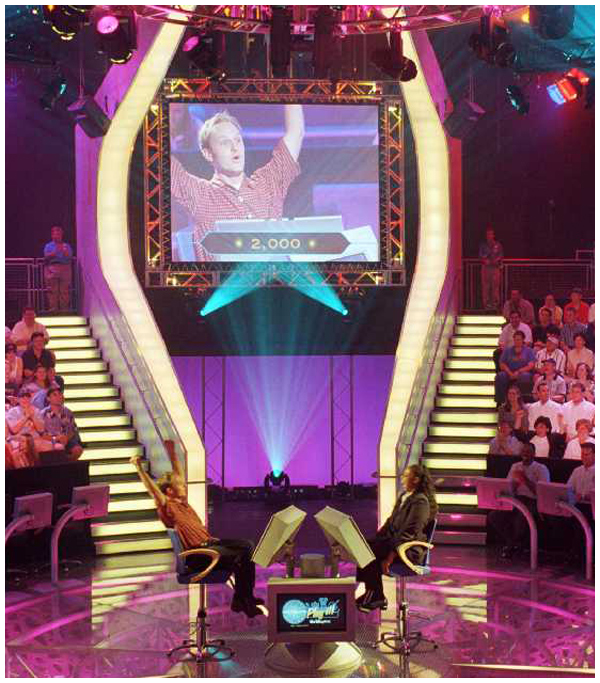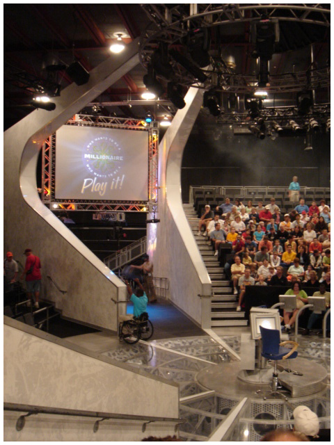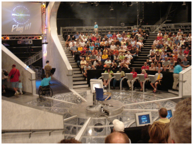 WHO WANTS TO BE A MILLIONAIRE, PLAY IT! was an attraction at Disney's Hollywood Studios theme park at Walt Disney World Resort in Orlando, Florida and Disney's California Adventure Park in Anaheim, California. The attraction was a modified version of the TV show with several shows per day lasting 25 minutes. The set was an enlarged version of my standard design to allow for larger audience ( 647 park guests ).