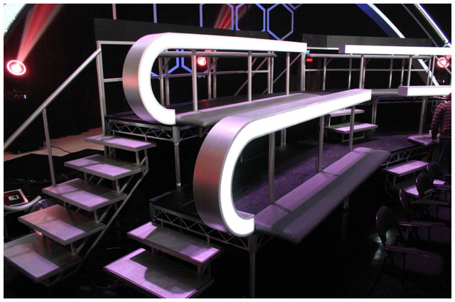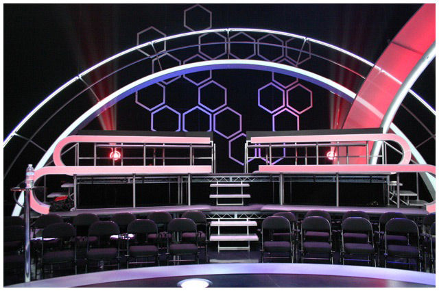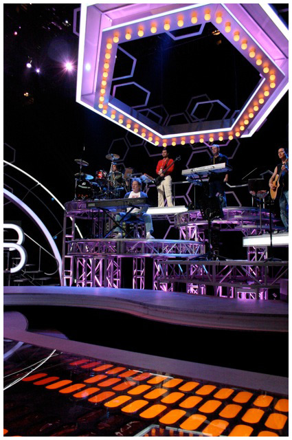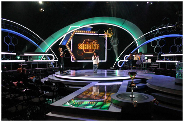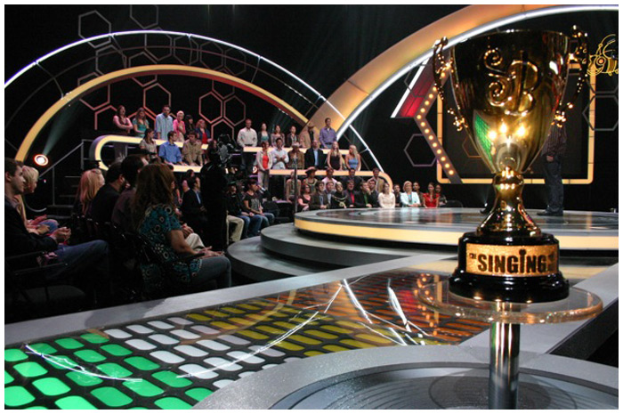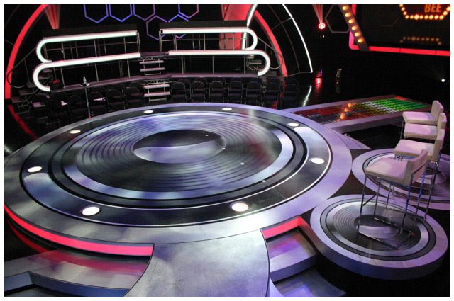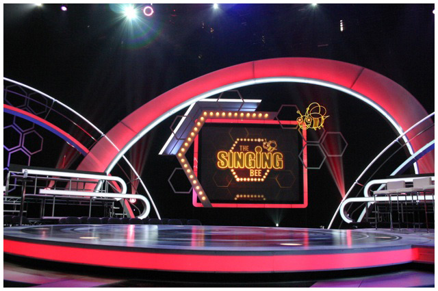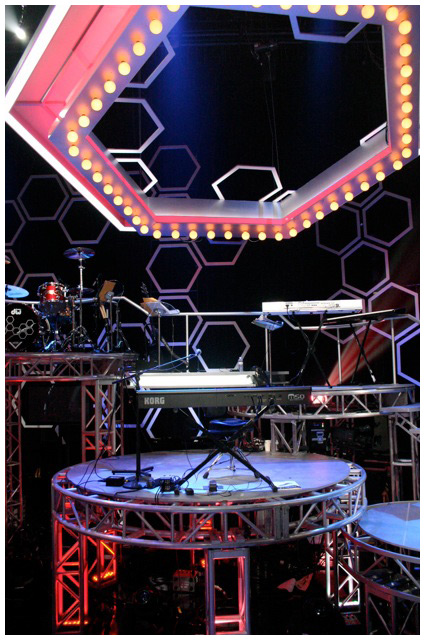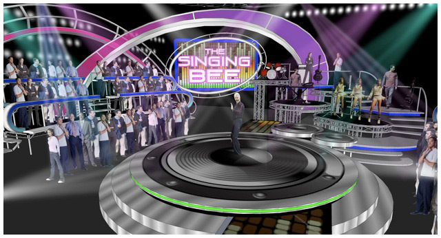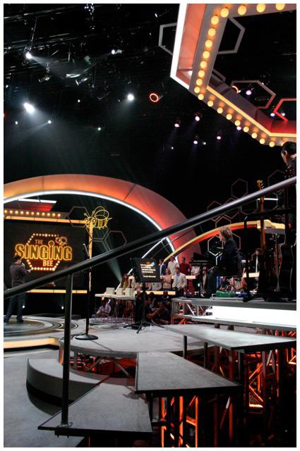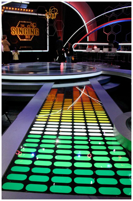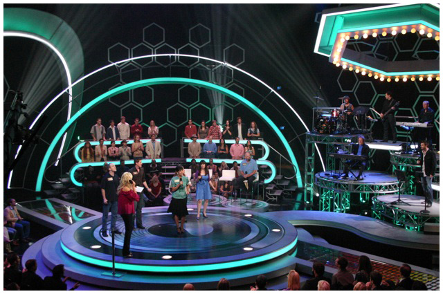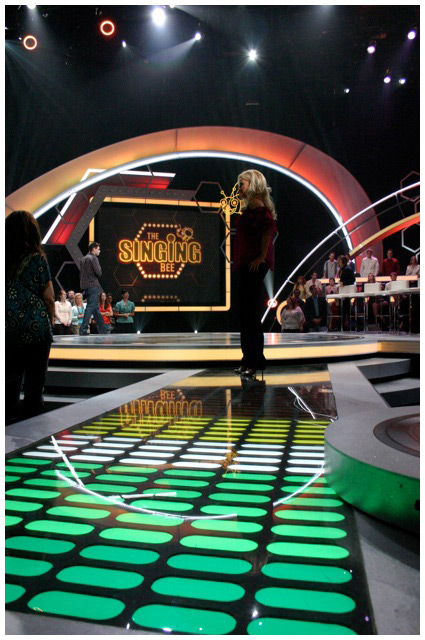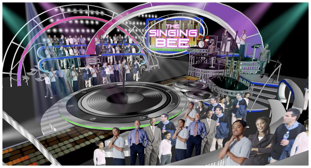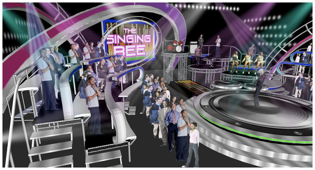 I was asked to design a new version of this show having done it previously for NBC. I suggested doing the show ' in the round ' to help create a party atmosphere for this karaoke extravaganza. My previous incarnation had been a safe prime time look but with this new version I decided to go whimsical and make this giant Juke box interior somewhere the viewers would want to spend 30 minutes.