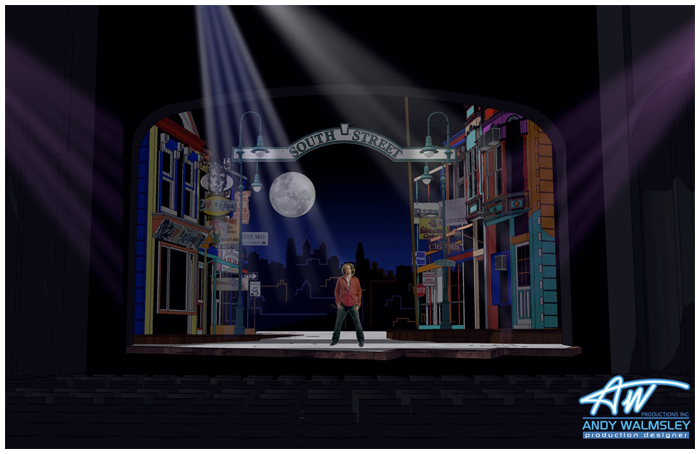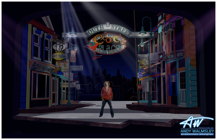 In the fall of 2011 I designed a brand new musical premiering at the famous Pasadena playhouse. the show takes place on Philadelphia's famous ' South Street ' when the action shifts from the street to the inside of one of the famous bars ( a converted fire house ) the street spins around on two turntables to reveal the forced perspective bar interior.