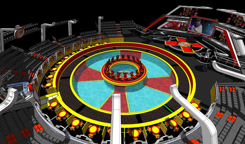 I was approached to design a crazy ambitious game show for the CW network based on Musical chairs. A sort of hybrid between American Idol and Wipeout. The set was extremely large shot on the famous Esther Williams stage at Sony studios. I designed not only a full scale band stage set but also the race track, tank area, dozens of complex games, the actual ' chairs ' a host area and even the locker rooms. Months of work that nearly killed me but it's a really fun show and certainly a different experience for me.