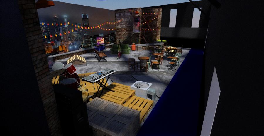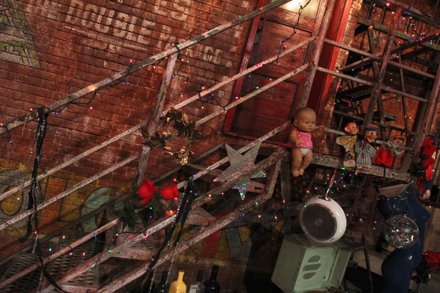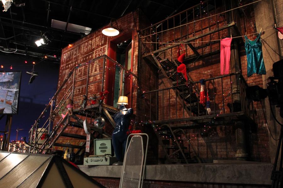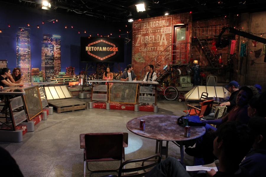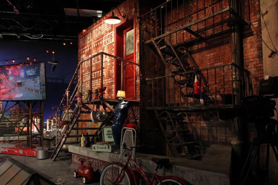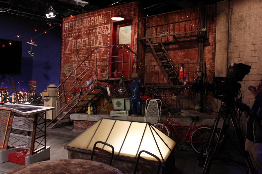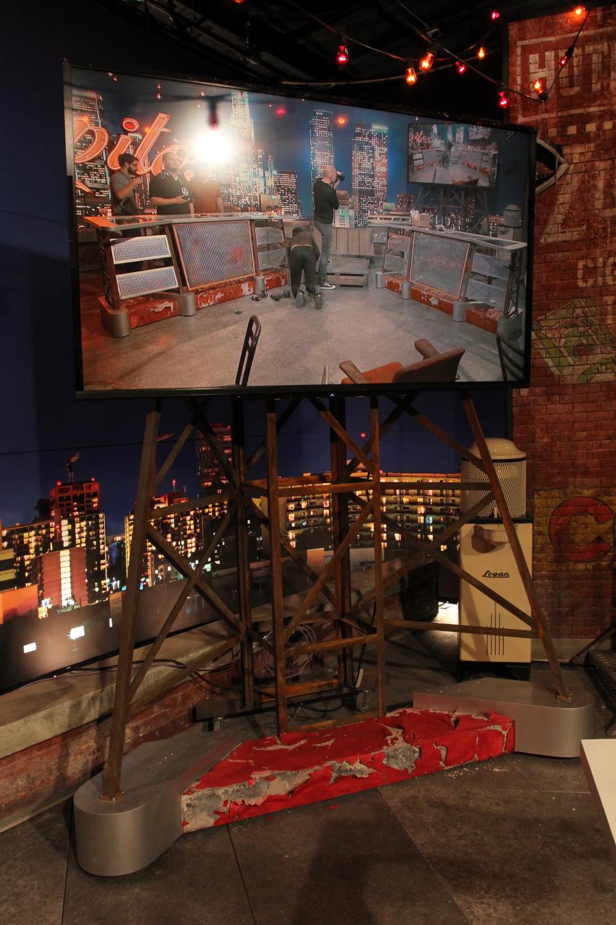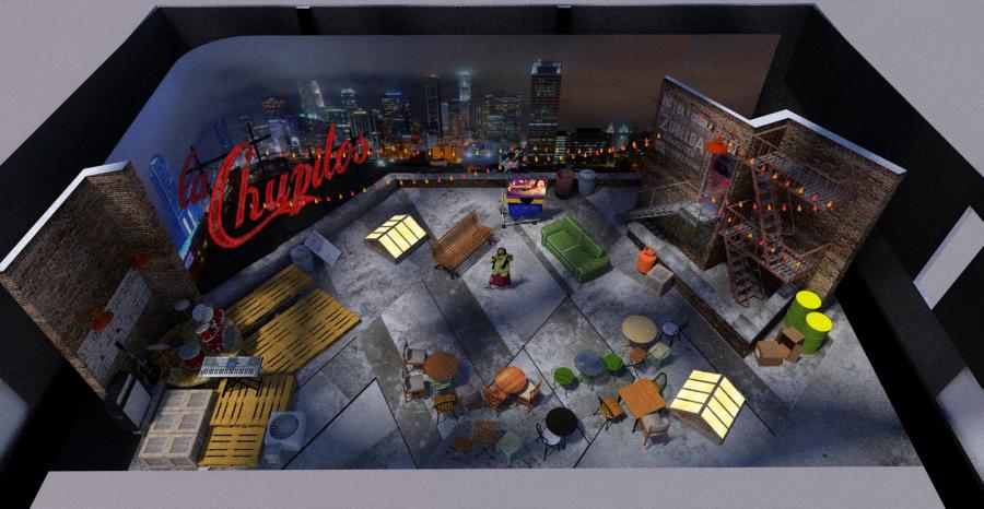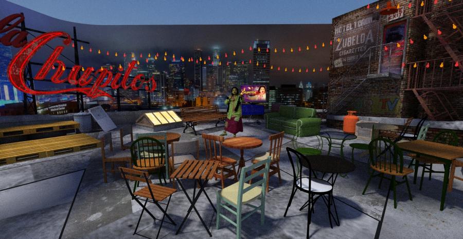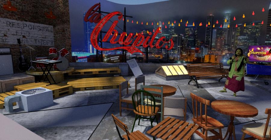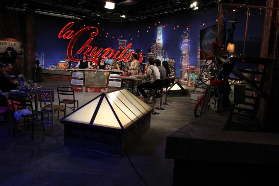Famous Mexican comedienne 'Chupitos' celebrity panel show echos her ' homeless bag lady ' character with my concept to place the show on a downtown LA rooftop which is her ' studio ' surrounded by junk and items she has collected on the streets.