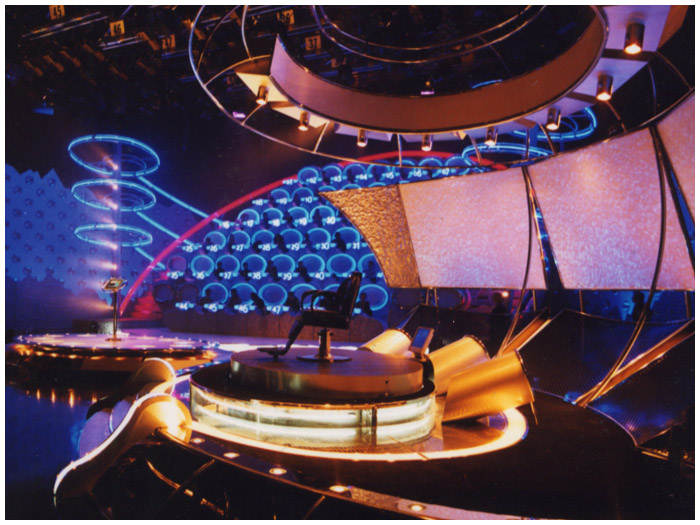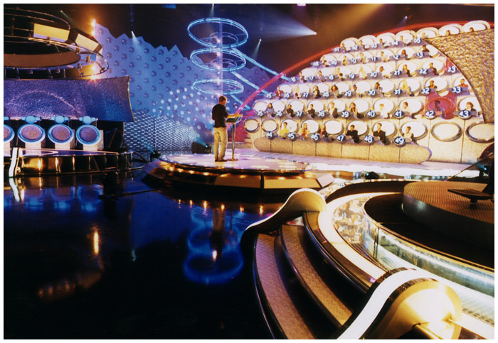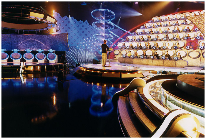 This was a huge show. Broadcast live from the double studio at fountain studios the set was very complex and had to answer many briefs to work with the various games played and the very strict legal guideline that came along with the national lottery.